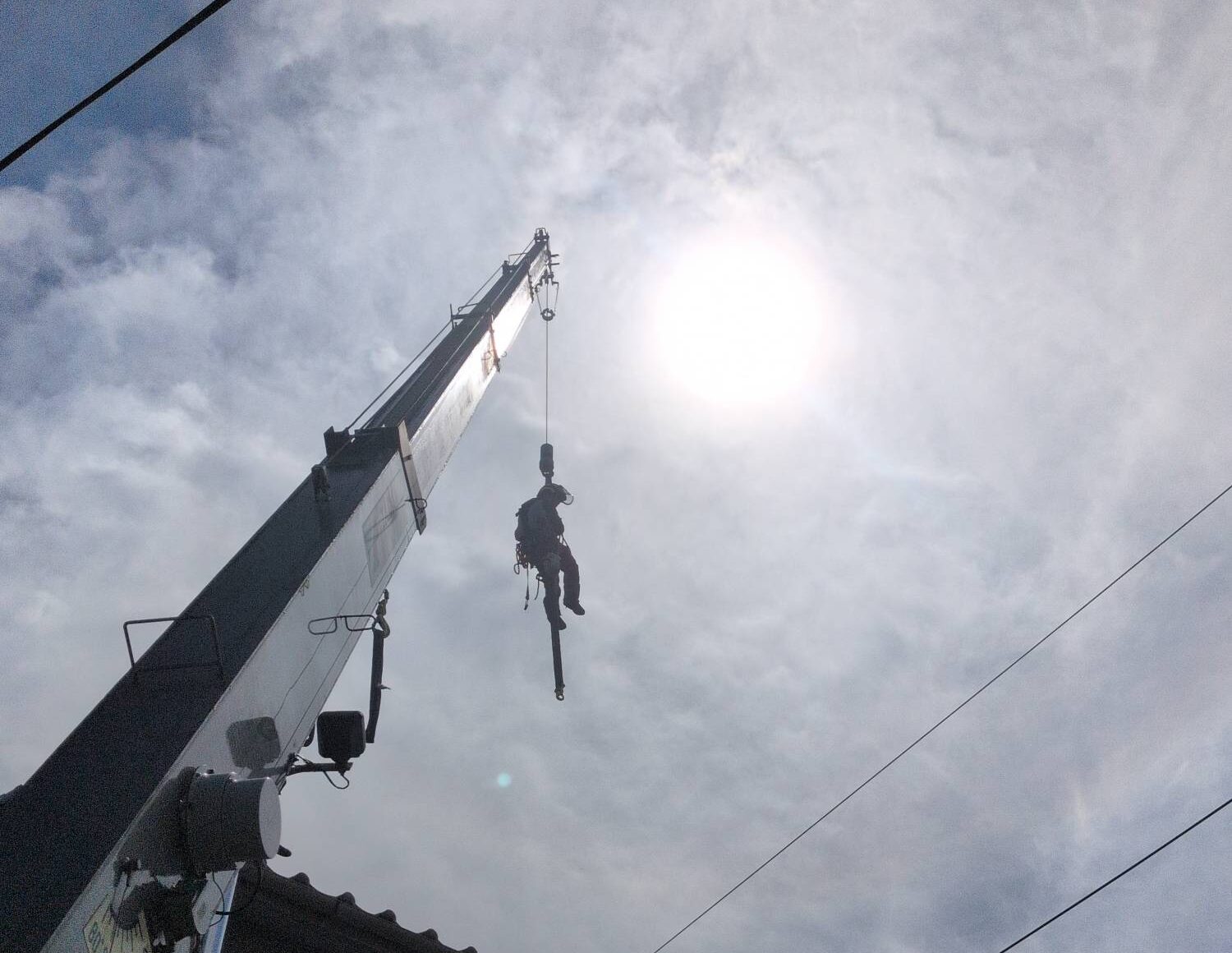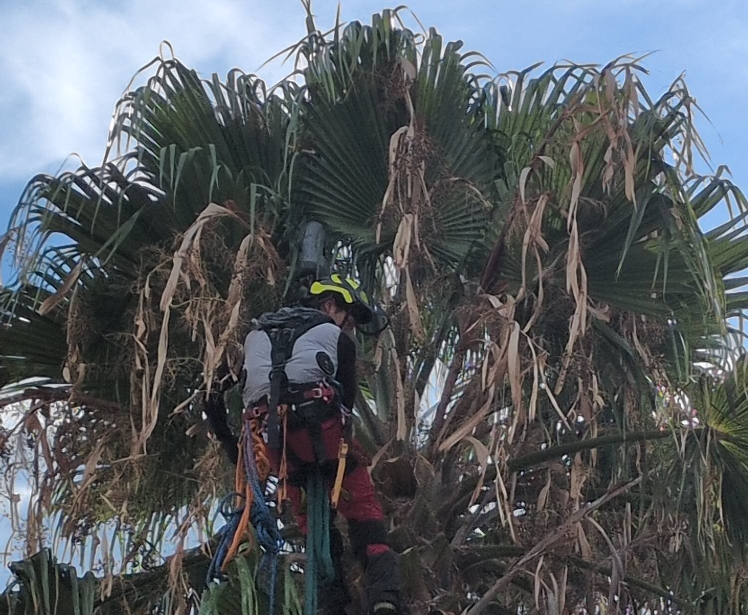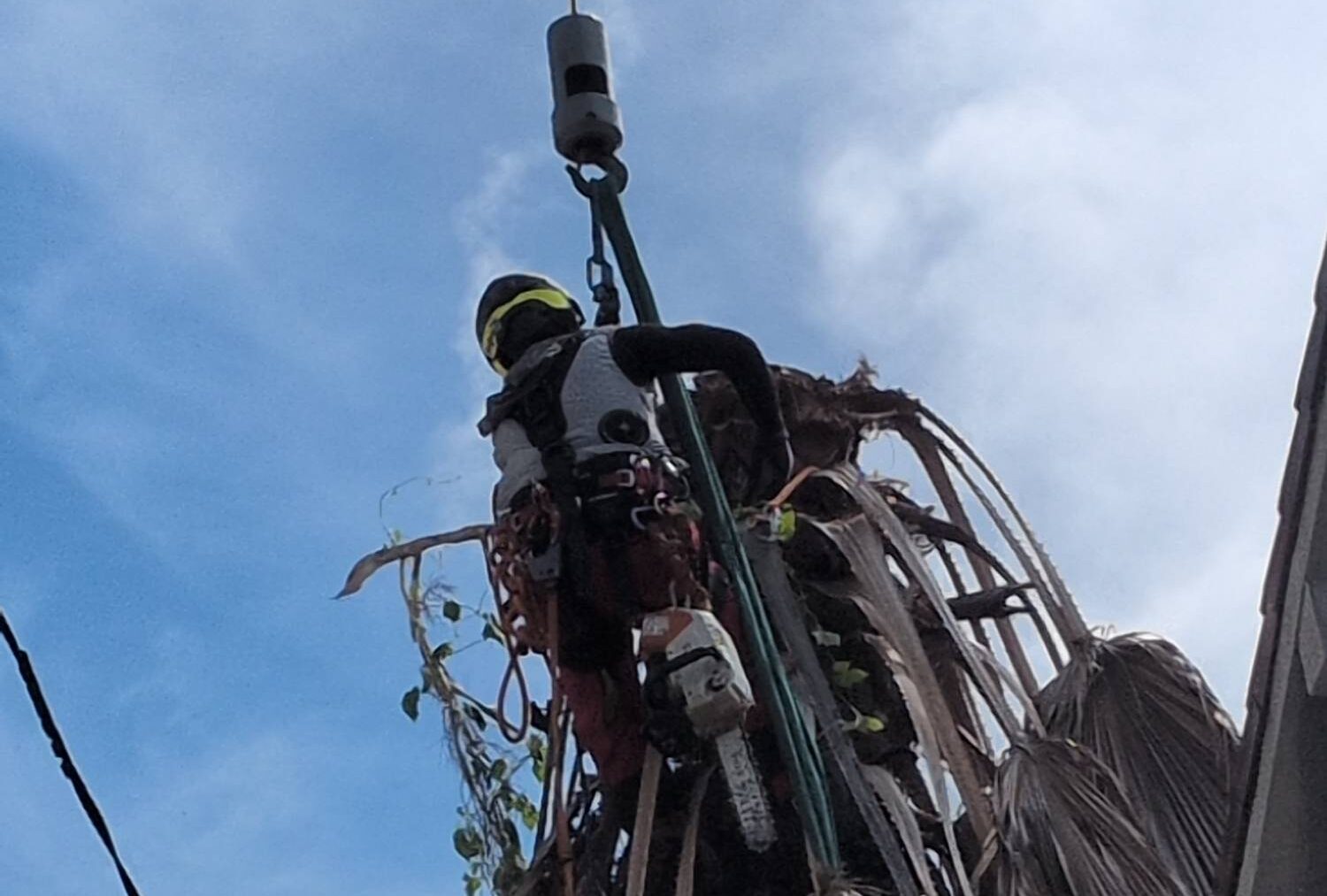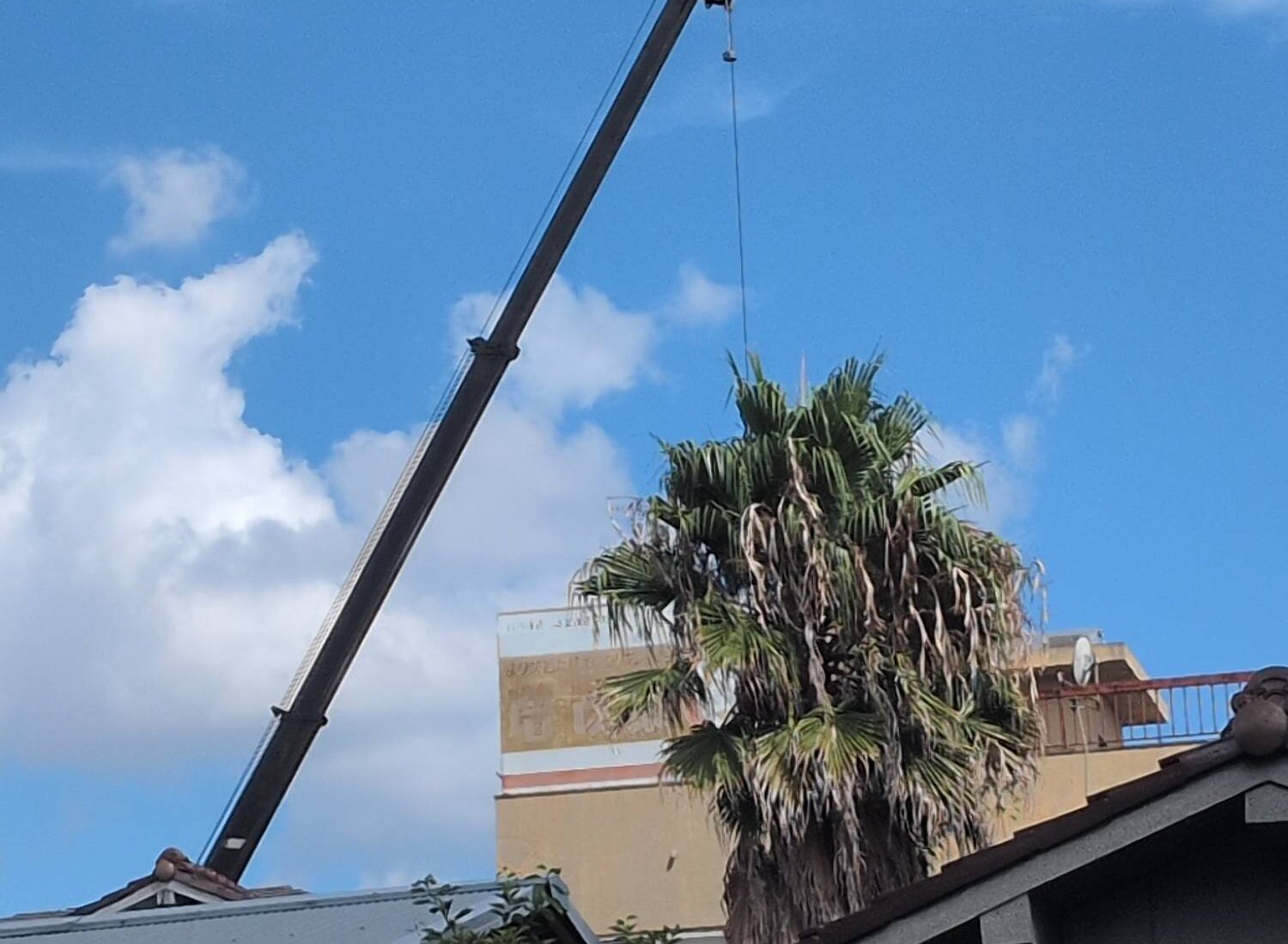 近隣の建物よりも高く伸びたヤシの木を伐採。クレーンで吊られた状態で、伸びた葉や枝を剪定。軽量化してから段階的に切断。狭い場所にあったヤシの木もきれいに伐採されました。