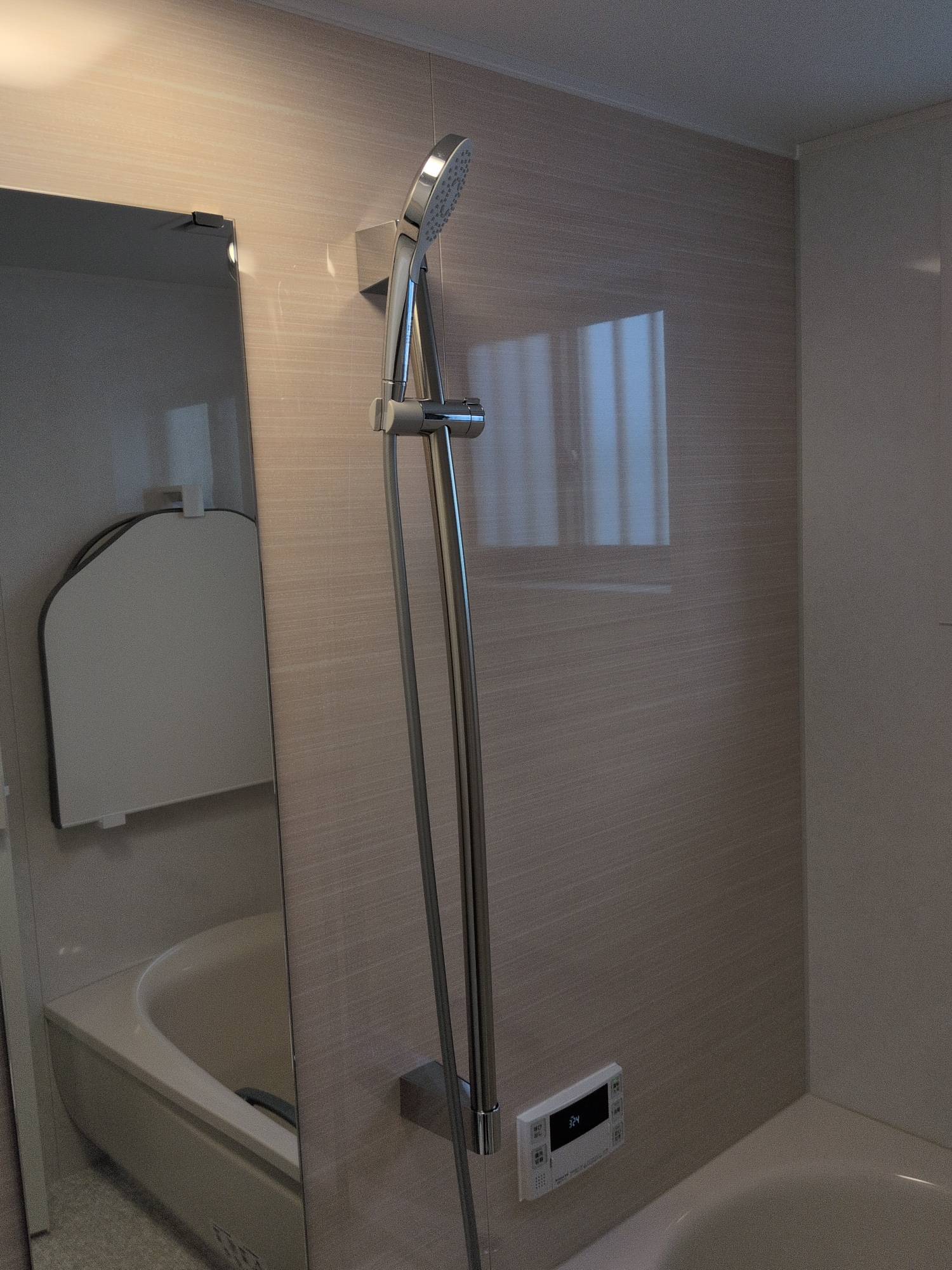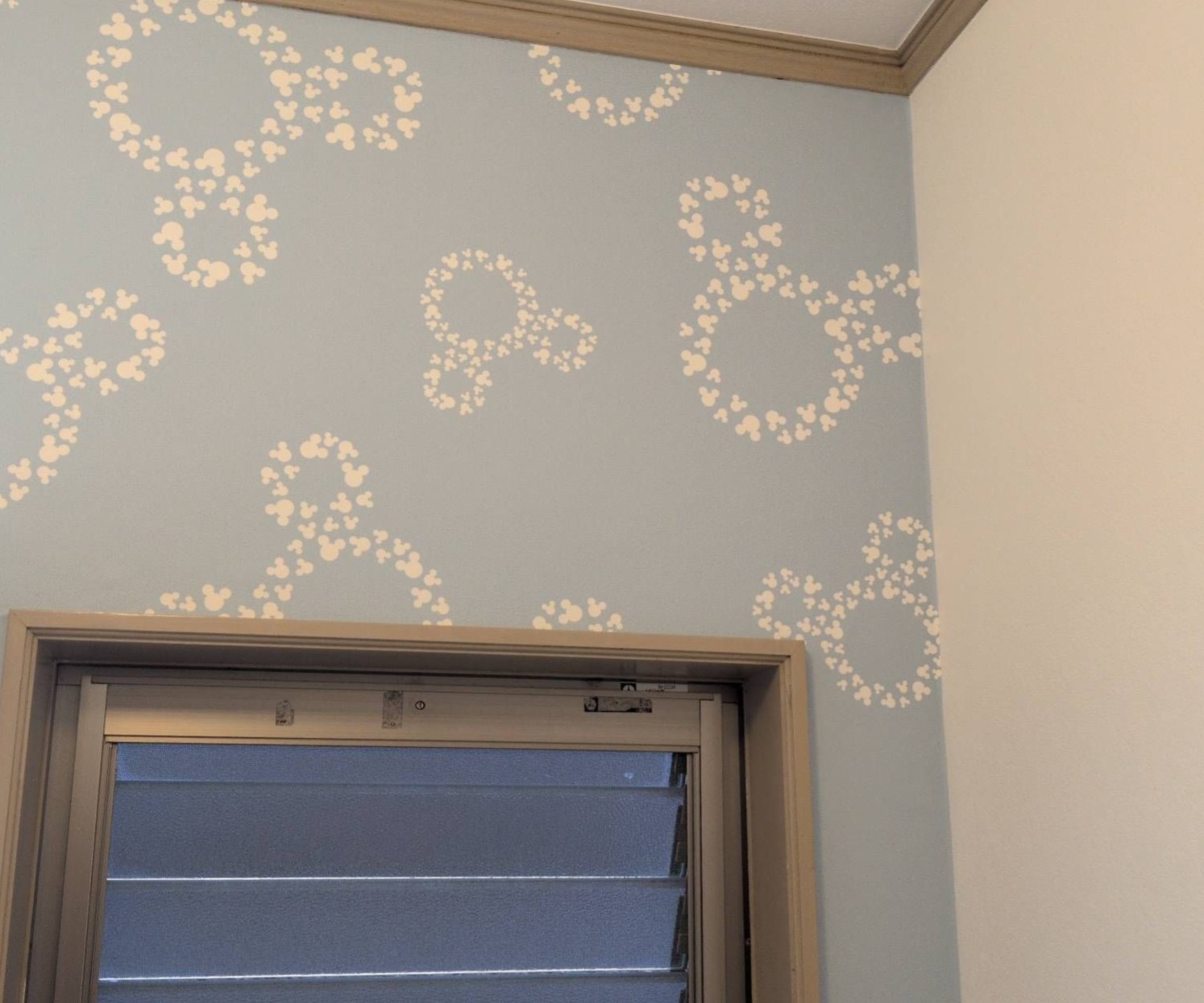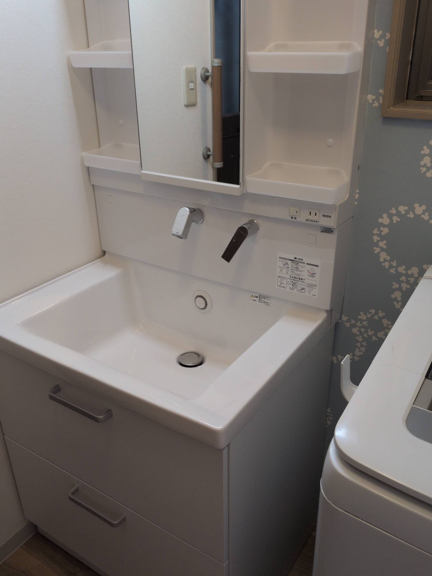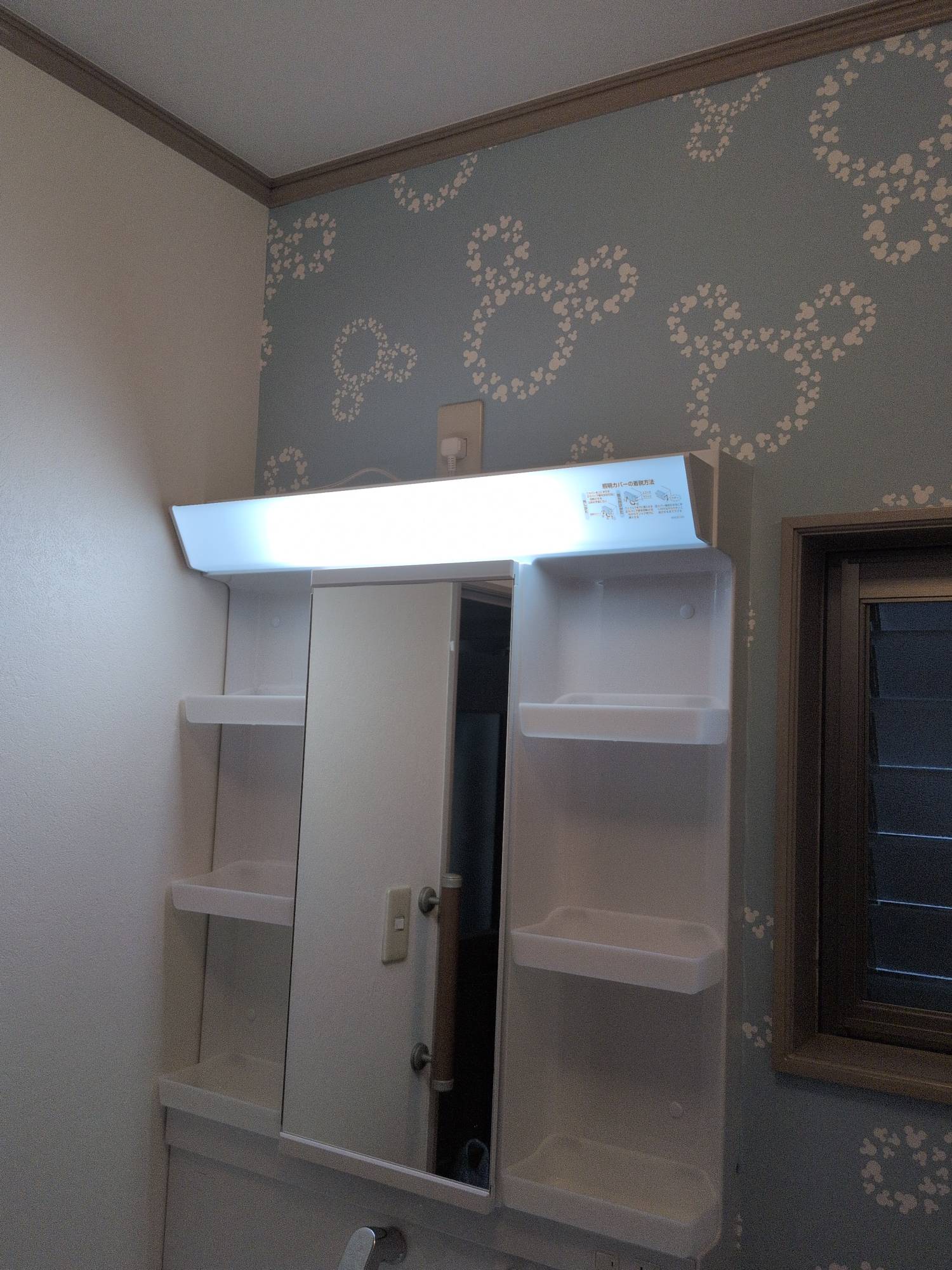 システムバス、洗面台の水廻り同時入替工事をしました。洗面所にはキャラクター風の壁紙をアクセントクロスに選ばれ、かわいく仕上がりました。