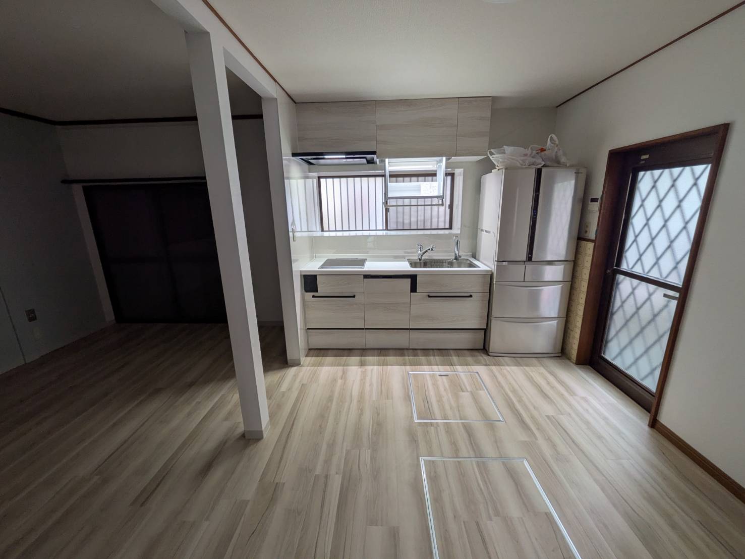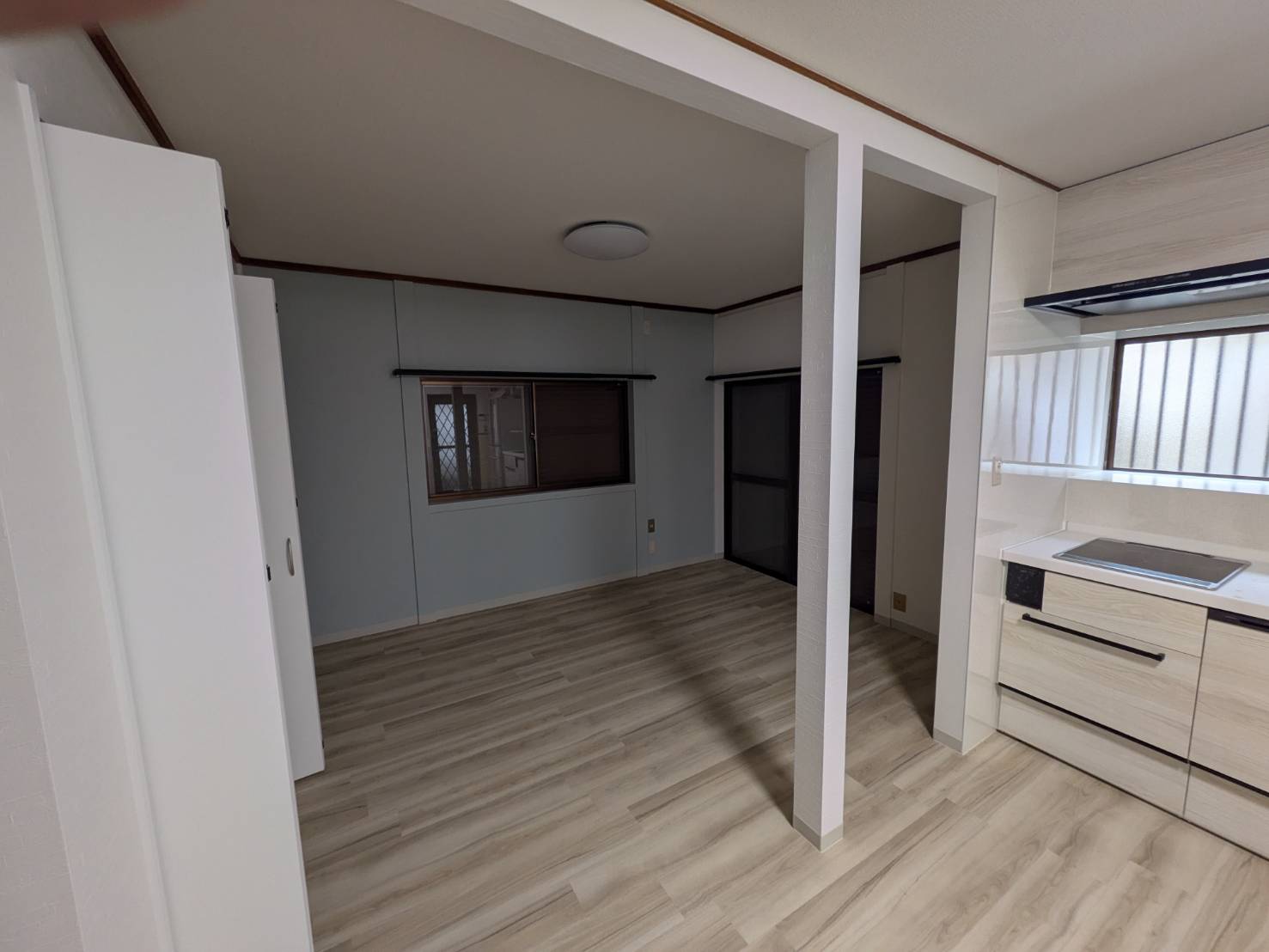 和室を洋室へと改修し、キッチンとつながる開放的な空間にリフォームしました。間仕切りをなくすことで、明るく広がりのあるLDKを実現。あわせて浴室も一新し、ボタンひとつで床まわりのきれいが続く「床ワイパー洗浄」を採用。床面のすみずみまで洗浄・除菌でき、毎日のお手入れがラクになる、快適で暮らしやすい住まいに仕上がっています。
